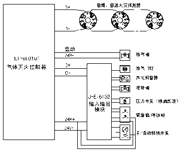 氣體滅火控制器通過(guò)公共接線板S+、S-端子連接各分區(qū)的全部感煙、感溫火災(zāi)探測(cè)器;通過(guò)各分區(qū)接線板C+、C-連接本區(qū)氣體輸入輸出模塊,通過(guò)該模塊連接本區(qū)選擇閥、聲光報(bào)警器、放氣門燈、緊急啟/停按鈕、手/自動(dòng)轉(zhuǎn)換開(kāi)關(guān)等現(xiàn)場(chǎng)設(shè)備;通過(guò)各分區(qū)接線板有源或無(wú)源輸出端連接本區(qū)放氣閥。如下圖所示: