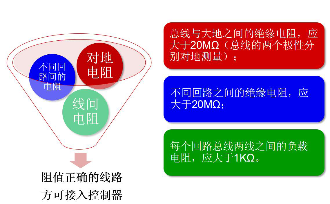 火災(zāi)自動(dòng)報(bào)警系統(tǒng)導(dǎo)線敷設(shè)后,在安裝現(xiàn)場設(shè)備之前,應(yīng)對每回路的導(dǎo)線用500V的兆歐表(搖表)測量絕緣電阻,其對地絕緣電阻值不應(yīng)小于20MΩ。接好設(shè)備后,用萬用表的歐姆檔檢查線間是否短路,阻值是否正常(大于1KΩ),線路是否接地(大于20MΩ)。有以上故障應(yīng)及時(shí)處理。