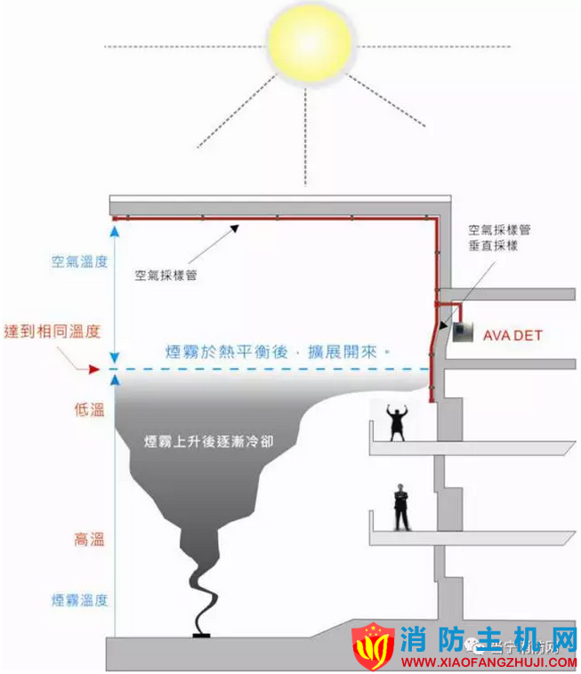 垂直采樣,用于空間高度較高或者有熱屏障效應(yīng)的場所。因為煙霧不能或及時到達(dá)空間上層,此時就需要在垂直方向的管道上開采樣孔,,以達(dá)到煙霧探測。一般間隔3米或者溫度誤差2℃開一個采樣孔。