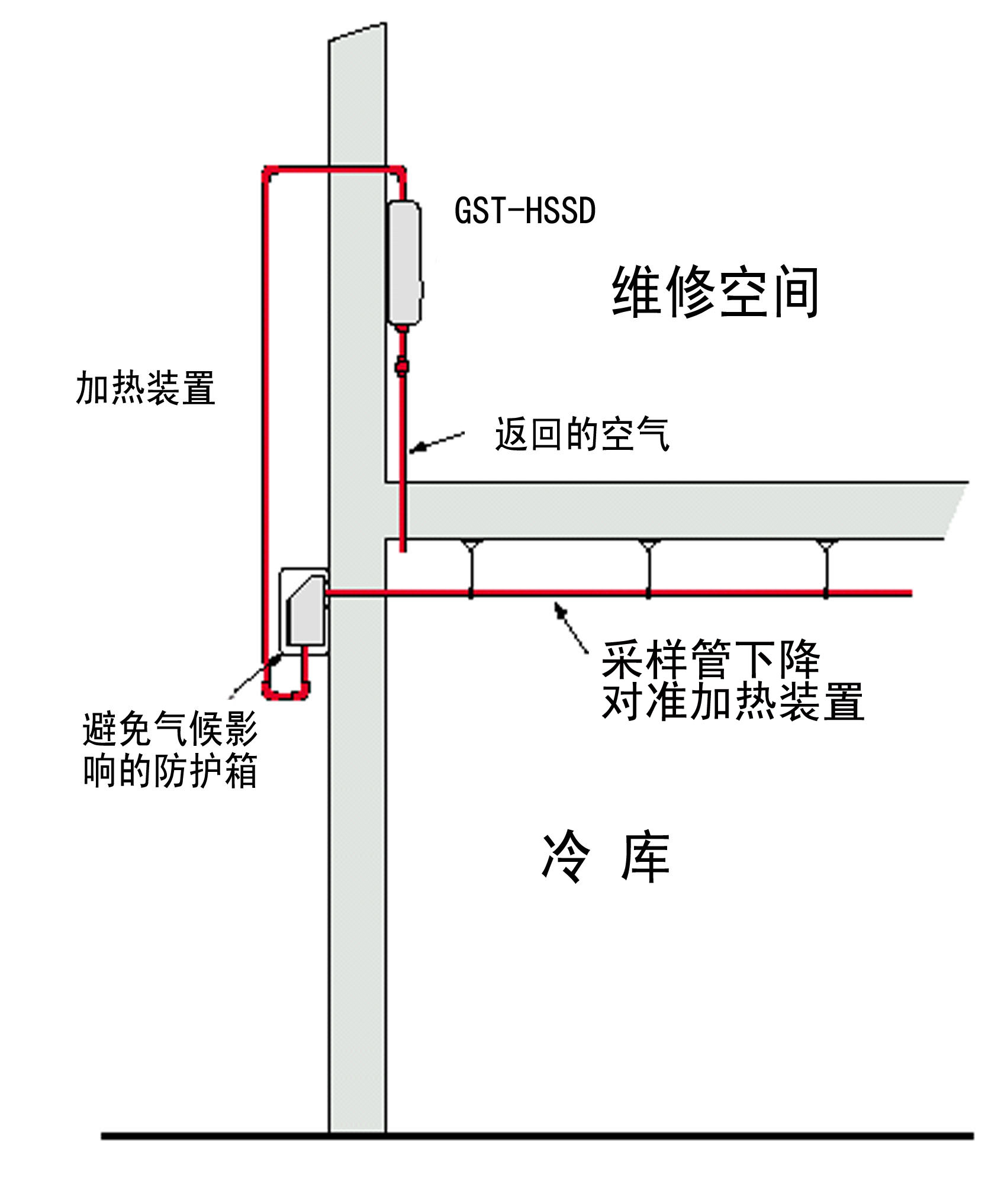 冷庫中采樣管,加熱箱和吸氣式感煙火災探測器的相對位置