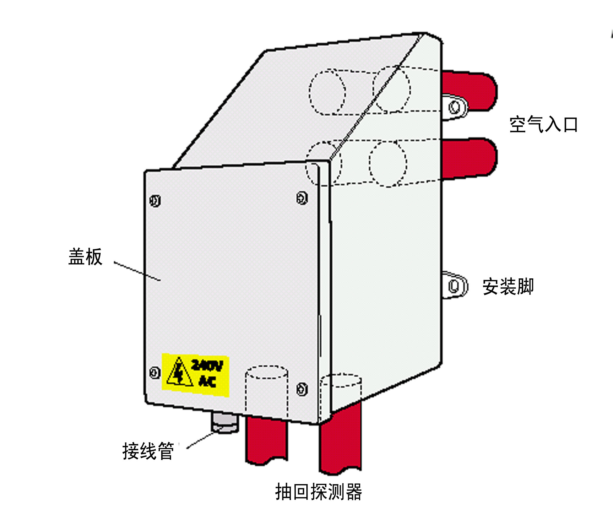 <!--[if !supportLists]-->§ <!--[endif]-->如果沒有維修空間,加熱器和GST空氣采樣式感煙火災探測報警器都可以安裝在建筑物墻上的避免氣候影響的防護箱內(nèi)。